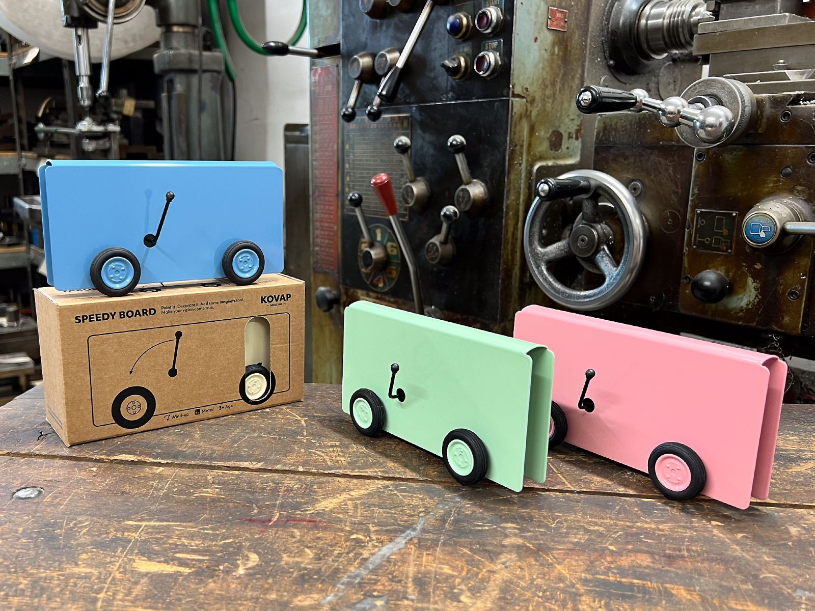 Pod vtipným názvem FOFRTABULE se skrývá barevná plechová tabulka na kolečkách, vytvořená ve spolupráci s designérským studiem Qubus. Tabulka umožňuje dětem i dospělým kreslit, psát vzkazy nebo ji ozdobit magnety. Díky mechanickému strojku se pak může sama rozjet – třeba se vzkazem až na druhý konec stolu. Hračka tak spojuje klasické kovové řemeslo s nápaditým designem a interaktivní zábavou.
