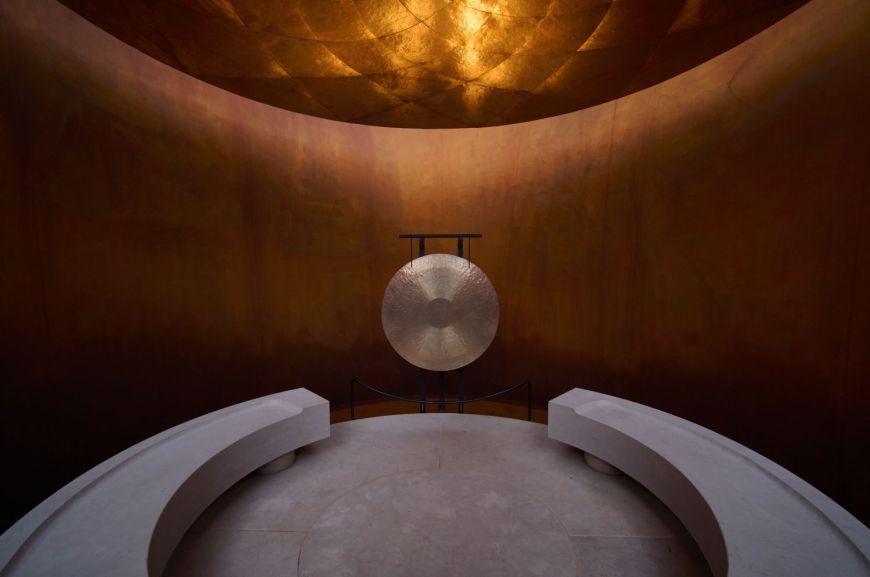 Khushnu Panthaki Hoof dodává: „Zvuk, který rezonuje naším tělem, ruší hranici mezi návštěvníkem a samotnou budovou. Stavba odráží zvuk zpět, čímž se cesta i samotná komora proměňují v rezonanční nástroje. V posledním desetiletí života se Doshi částečně odklonil od architektury k umění, ale u tohoto projektu se vrátil k dřívějšímu procesu navrhování – nejprve psal, poté nás vedl při tvarování designu. Základem projektu byl zážitek Rolfa Fehlbauma a jeho manželky Federicy Zanco z návštěvy malé indické svatyně u Chrámu Slunce v Gudžarátu. Následovaly Doshiho sny a záměry – texty, skici a vizuální materiály plné vrstev a dualit.“