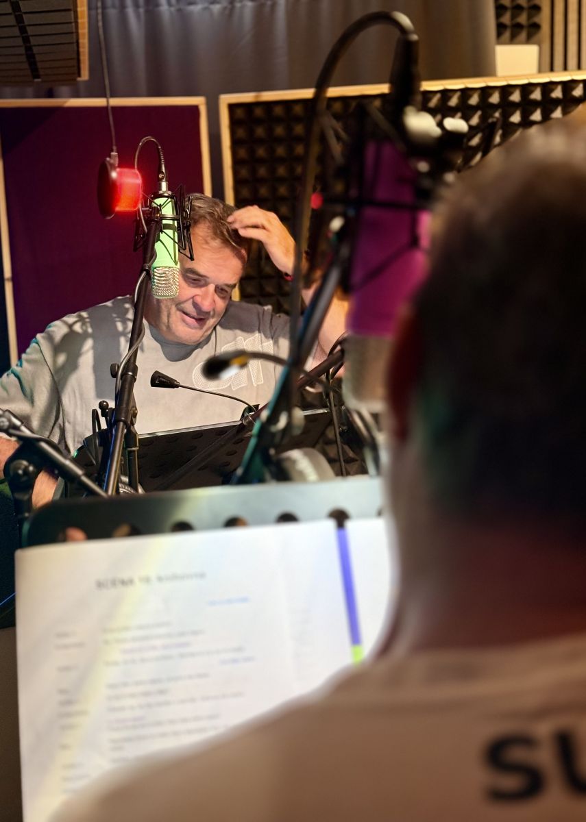 Natáčení bylo rozdělené do dvou částí. První se zúčastnilo více představitelů hlavních rolí, kteří se sešli ve studiu společně, aby autentické dialogy a interakce dodaly dramatizaci na autentičnosti. Menší role se dotáčely následně. Reálně se nabíraly také některé zvukové efekty – například srkání čaje, mlaskání nebo potahování z cigarety. Autentický je i zvuk letadla, který zvukař natočil po cestě ze studia v Londýně.