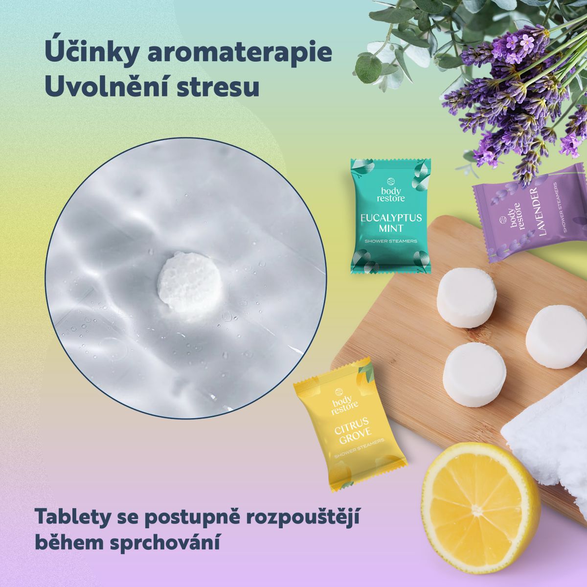 Značka Body Restore pochází z USA, kde se stala nejprodávanější značkou aromaterapeutických tablet do sprchy. Tablety jsou vyrobeny ve Spojených státech, obsahují přírodní esenciální oleje, jsou veganské, cruelty free a bez parabenů. Použití je velmi jednoduché. Stačí položit jednu tabletu Body Restore na podlahu sprchy mimo přímý proud vody. Teplá voda ji začne pomalu rozpouštět a aktivuje směs přírodních esenciálních olejů, které se uvolňují do prostoru. Sprchový kout se během okamžiku naplní vůní, která povzbudí tělo, zklidní mysl a probudí vaše smysly. Každá tableta se beze zbytku rozpustí, nezanechává zbytky ani mastný film a neucpává odpad, takže po sprše zůstává vše čisté, jen příjemná vůně a pocit svěžesti.