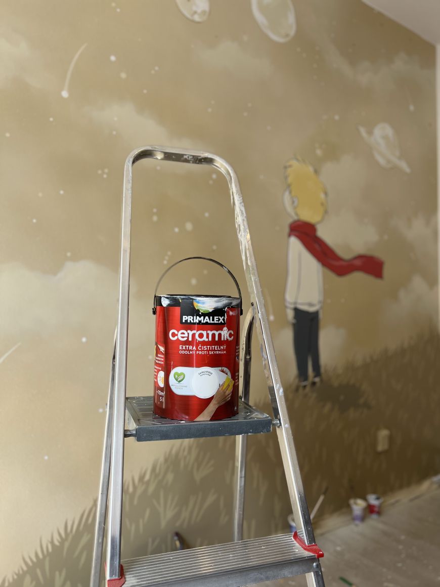 Začněte barevným pozadím. Celou stěnu vymalujte válečkem nebo stříkací pistolí. Barvu před použitím dobře promíchejte a nanášejte ve dvou vrstvách s odstupem alespoň šesti hodin. „Do dětského pokoje doporučuji kvalitní čistitelný nátěr, například Primalex Ceramic. Vytváří odolný, paropropustný, stálobarevný a krásně matný povrch. Navíc si ho můžete nechat natónovat až do 20 000 odstínů,“ dodává Radek Kříž.