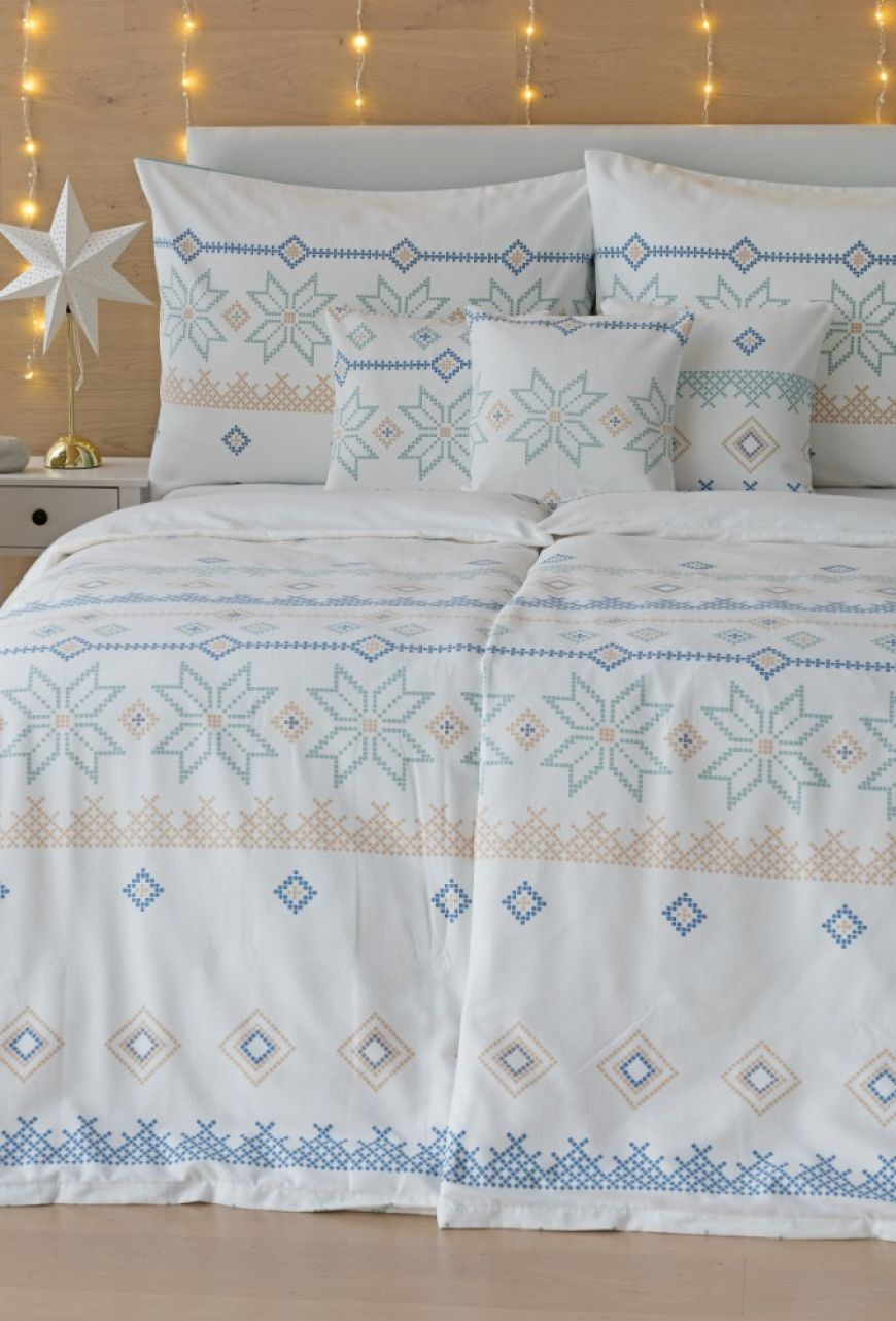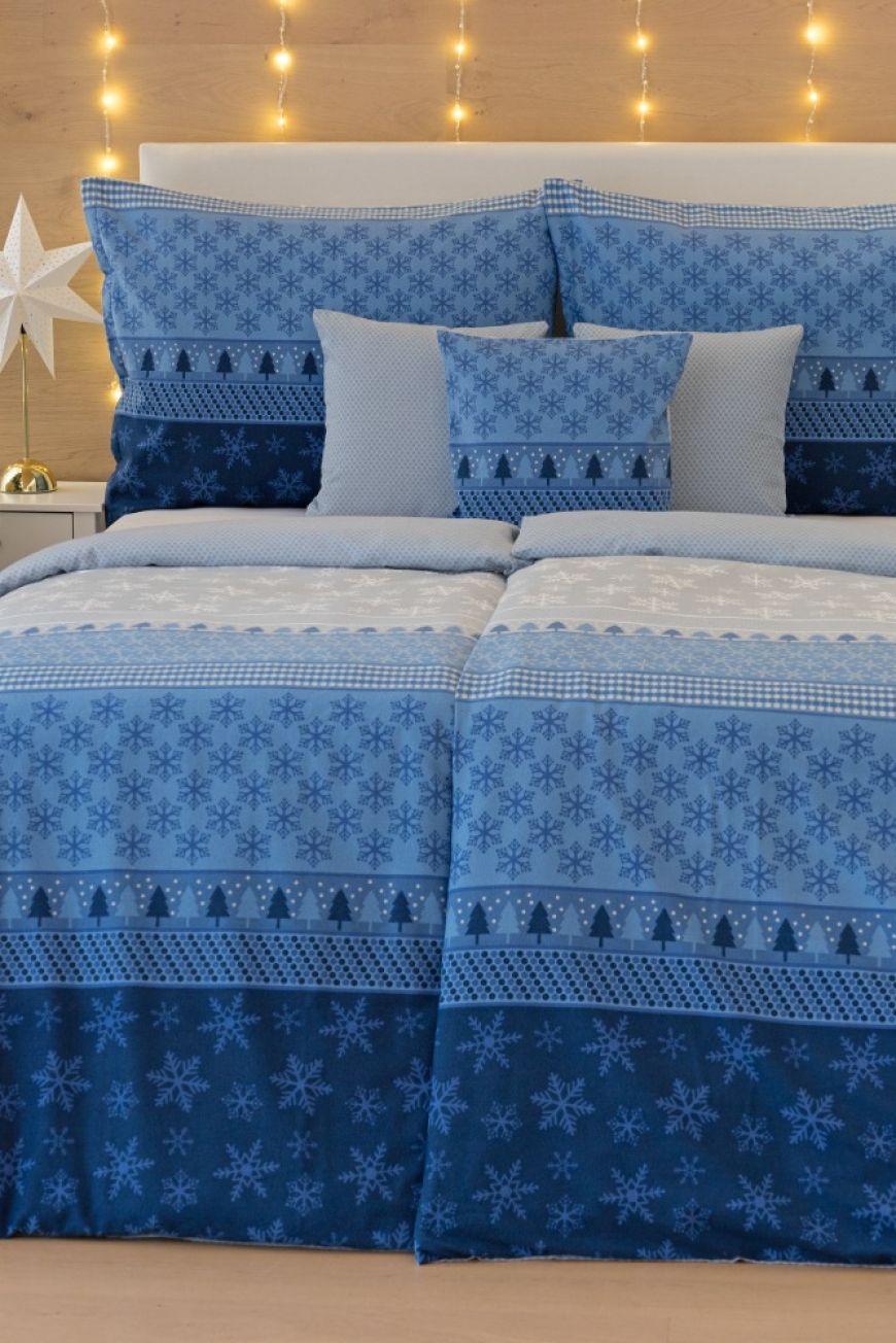Povlečení Aspen se skandinávsky laděným vzorem vytváří klidnou atmosféru, zatímco Santo Blue nabízí výraznější zimní modrý dekor.